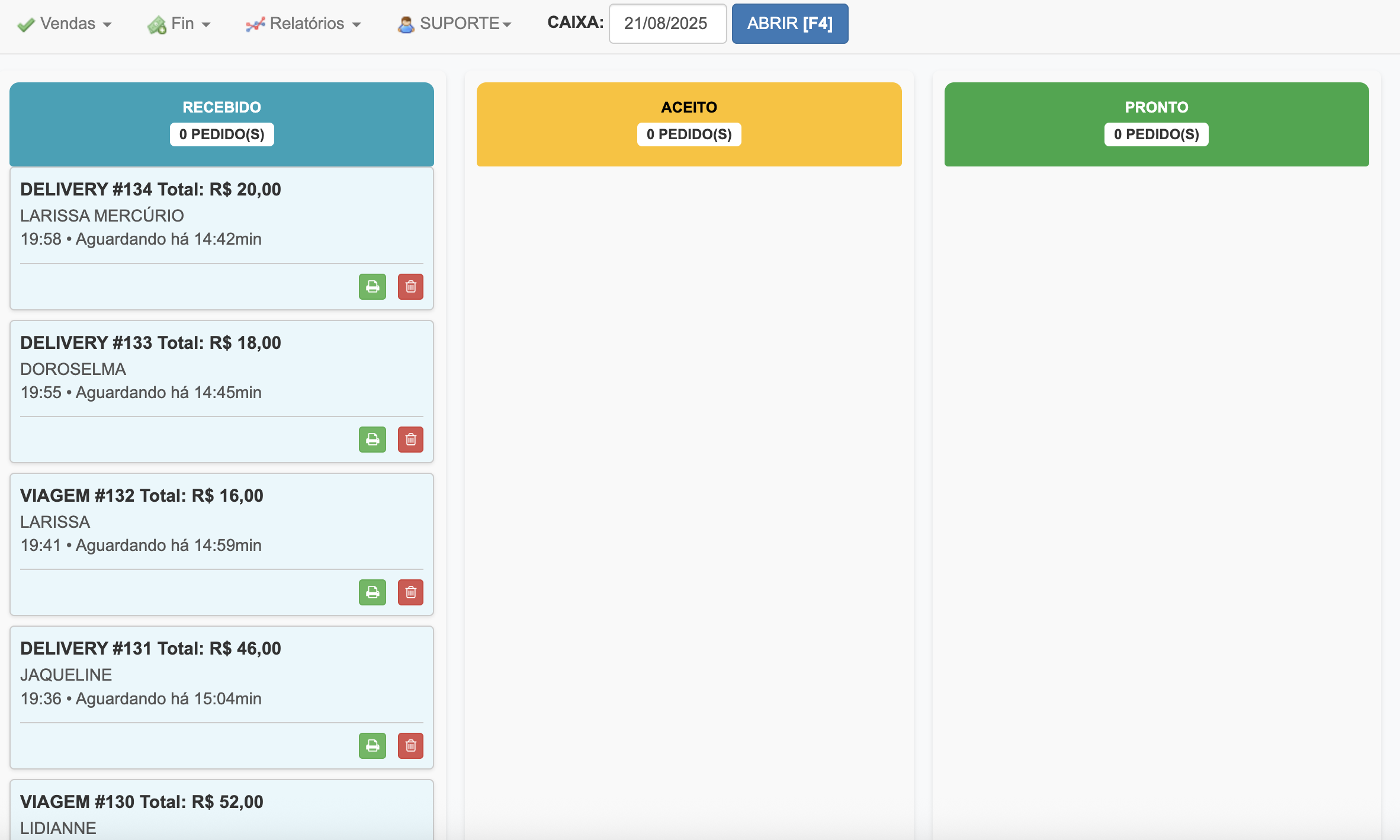 Os pedidos chegam em tempo real e você visualiza no painel de pedidos. Você controla o andamento arrastando o pedido para Aceito e depois Pronto.